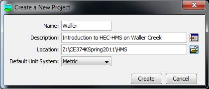 The first of the Components we will consider is the Basin Model. To create a hydrologic model of Waller Creek, we need to import the basin file that you just downloaded. In HMS Project Window, use File/New to open a new project by entering the following data