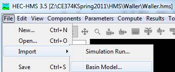 In the HMS Main Window, use File/Import/Basin Model… to import the basin model file Waller_Ck.basin from your working directory.