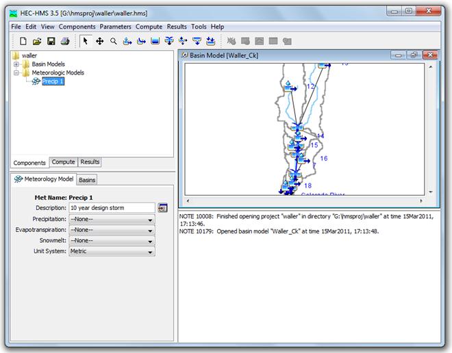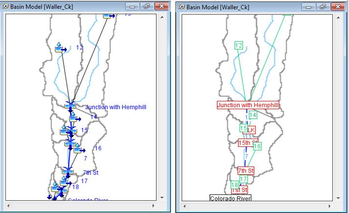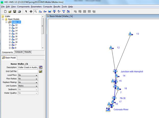 You should then see a schematic of Waller Creek showing the watershed and stream map and an overlay of the hydrologic elements in the Basin Model Panel