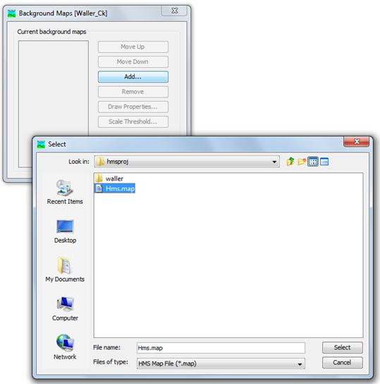 A new window will appear, click Add... change the Files of type option to HMS Map File (*.map) and select Hms.map from your working directory.