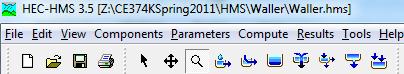 You'll see in the waller folder a subfolder called Basin Models in the Data Panel on the left hand side of the HMS model display, expand it and select Waller_Ck, the Basin window open up and some icons appear.