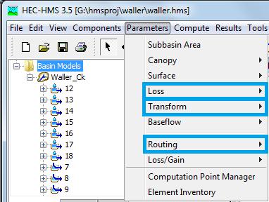 As the calculation steps above suggest, the primary function of a surface-water model such as the HMS involves three sets of calculations--quantifying rainfall losses into the soil, converting excess rainfall to runoff, and routing. As part of creating a HMS model, the selection of the processes to be used for each calculation set is made in the Parameters Option in the Top Menu.