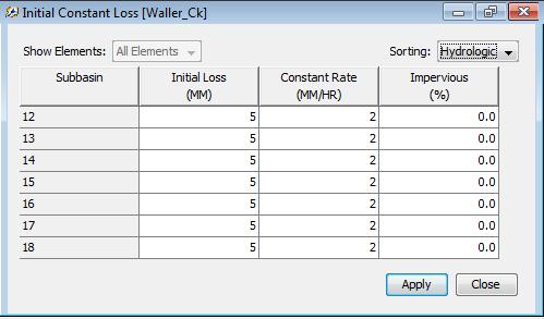Note that the Initial/Constant Loss Rate parameters are entered is in this table. Each basin requires an initial loss quantity, a constant loss rate, and a percent imperviousness. These values have been selected arbitrarily. If the % impervious value differs from 0, that % of the land area is assumed to have no losses and the loss method is applied only to the remainder of the drainage area