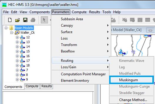 The next step involves entering the parameters for the routing process. From Parameters/ Reach / Muskingum.