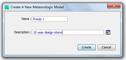Write Precip 1 as name and 10 year design storm in description, then click create.