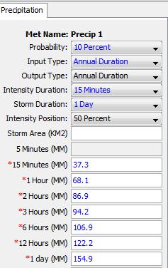 Now, in the Parameters panel fill in the values shown from the table above for a 10 year storm (10% chance of being equaled or exceeded in any year), as input type select Annual Duration, for Intensity Duration select 15 minutes, for Storm Duration select 1 Day don’t forget to use the correct precipitation units! (The program will ask you for millimeters). Here are the data for the 10 year return period storm:
