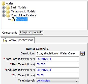 In the Parameter Panel, specify the duration of the simulation in date and time, and also the time interval of the calculations (10 minutes). In this case, the duration is arbitrary, long enough to depict the runoff from a 1-day storm, but the 10 minute time interval is part of the Basin file model setup and should remain fixed for this Waller Creek model.