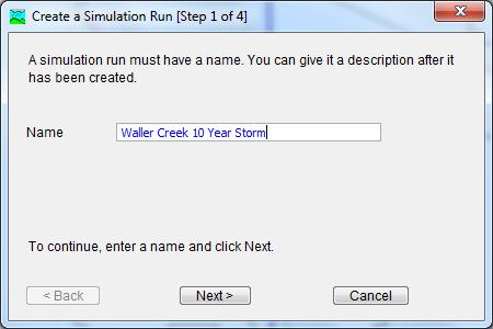 in the first step specify the Name of the Simulation 10 years Waller Creek and click