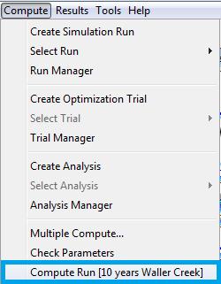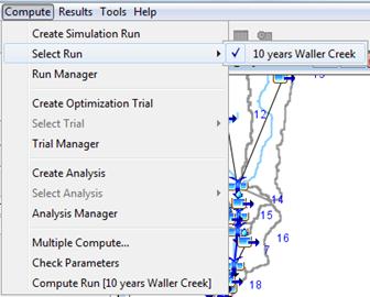 In the Main Window, select Compute/Select Run and you will see that 10 years Waller Creek is checked; in the case of multiple simulations runs it is important to check (select) the one that we want.