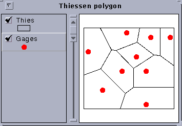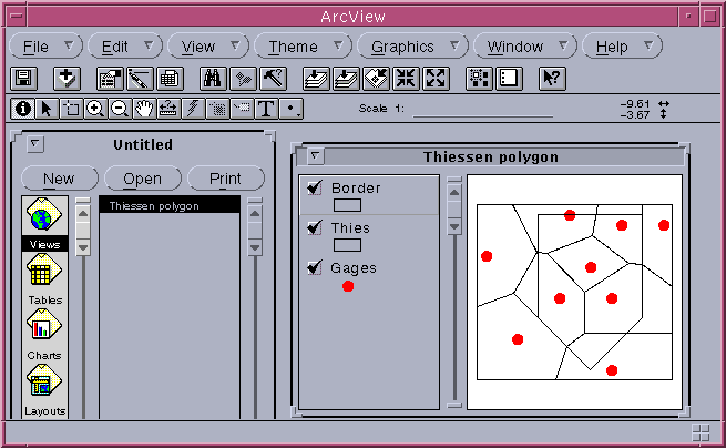 Now, start up arcview to see how it looks. Open a new view and in the view window click on add theme gages for the point coverage and thies for the Thiessen polygon. Here is the result. Wow! Looks pretty cool!