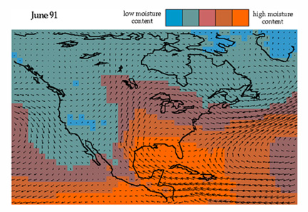 The flow of atmospheric water over North America during June of 1991 is shown below. The colors in this map represent the water content of the atmosphere, averaged over cells of 2 degrees of latitude and longitude, and over one month in time. This water content represents the average amount of precipitable water that an atmospheric column contains when integrated from the land surface to the top of the atmosphere. The arrows in the diagram depict the flow of atmospheric moisture, determined by taking the product of the wind velocity and the atmospheric water content, and integrating the result vertically through the atmospheric column. An animated moisture flow map can be viewed using the Quicktime or .avi viewers.