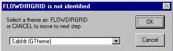 Choose "Yes" to snap to a river section and the mouse pointer will become a set of cross-hairs. Click on any location in the stream network of sabstr45.shp to delineate a watershed. At this point, the program checks to see if the required input Themes are available. If you have just added new Themes into your View and/or this is your first delineation, the program needs to know the identity of the input Themes. If the program does not know the identify a Theme that it needs, a menu of choices will pop-up for the user to identify the appropriate Themes. Since this is your first delineation in this Project, you will now be required to identify, the input Themes. You will see a series of message boxes that ask you to identify the RIVER Theme, the WATERSHED Theme, the FLOWDIRECTION GTheme, and the STREAM Gtheme. These message boxes, with the appropriate Theme name selected are shown below. You will also be asked to confirm your choice between each of the message boxes shown below.