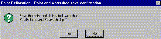 After delineation is complete, you will be asked whether you want to save the results to shapefiles named "PourPnt.Shp" and "PourWsh.Shp." These are the default names of shapefiles to which the selected pour-points and delineated watersheds are saved. You do not have to use these default names but just say "Yes" for now.