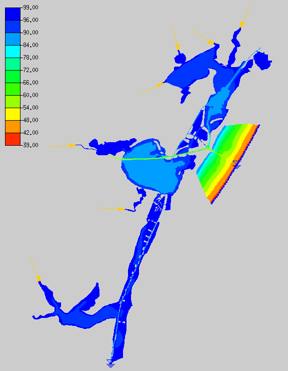 In the TxBLEND input data bottom elevations were given as depths. The TxBLEND input was converted to elevation values by subtracting the depths from a datum. An arbitrary datum was set at 100 feet below mean sea level. This was done to ensure only positive elevation values. The conversion was done in Excel. Bottom elevations are specified in the geometry file with the GNN card.