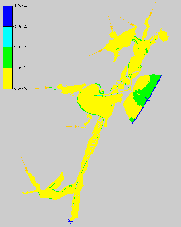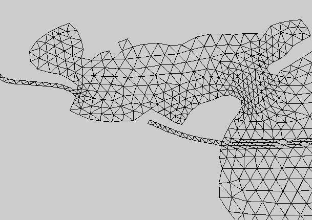 A steady state hydrodynamic model of the bay system was constructed. The model, which consists of over eight thousand triangular elements is constructed using TABS software distributed and maintained by the Waterways Experiment Station of the Army Corps of Engineers (Roig et. al., 1996). A graphical user interface called Surface Water Modeling System (SMS) ( Engineering Computer Graphics Laboratory , 1995) was used to pre- and post-process the data.