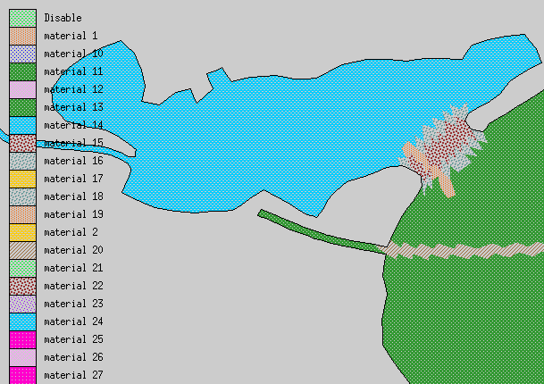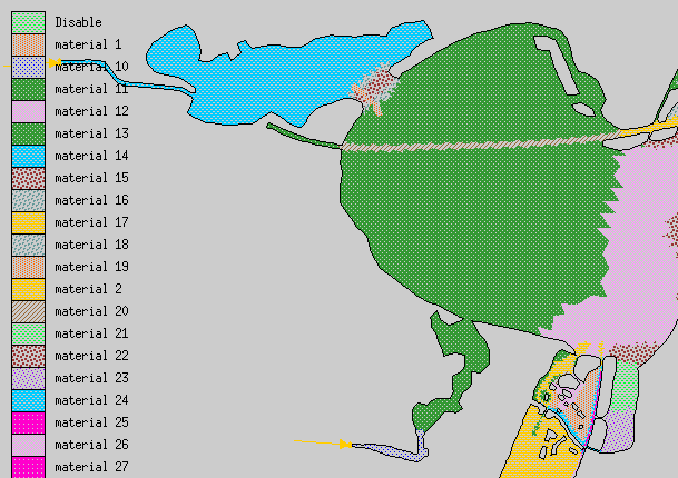 Material properties consist of Manning’s n values. The TxBLEND input data has Manning’s n values assigned to nodes. In TABS Manning’s n values are assigned to elements through material types. Each element was assigned a Manning’s n value equal to that of the majority of the three corner nodes. If all corner nodes had a different Manning’s n value the element was assigned a value equal to the first node. There is a maximum number of material types in TABS. For that reason the number of different Manning’s n values was reduced by rounding of one significant digit. This was done in Excel. Material properties are specified in the boundary conditions file with the EV card.