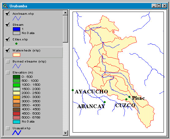 This web-page does not attempt to be a complete analysis of the hydrology of the Urubamba River system, nor does it attempt to be an ArcView tutorial. It is just a demonstration of how far one can get using basic and available data handled with ArcView 3.0 in a personal computer (IBM or compatible).