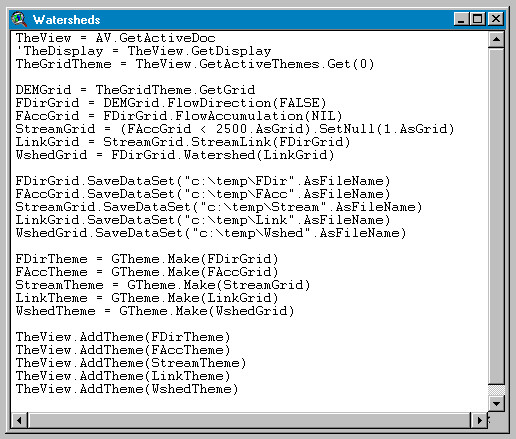 As in "Part I: Setting the DEM", it is assumed a working View window, and that it contains the Filled Burndem grid-theme. The stream and watershed delineation itself is made by the Watersheds script shown in Figure 10.