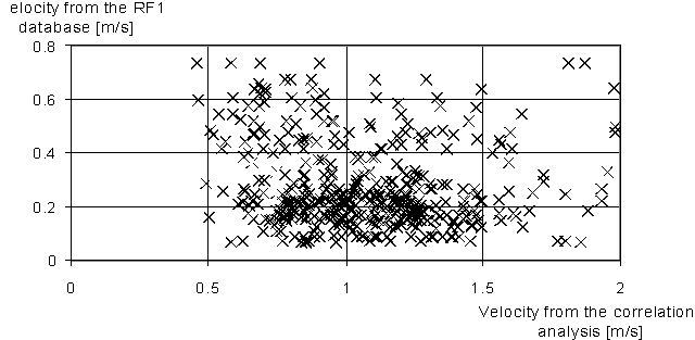 Figure 4.22 Comparison of the velocity from the RF1 database with the velocity estimated from a correlation analysis of the flow record in the Iowa River and tributaries