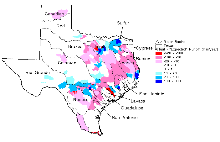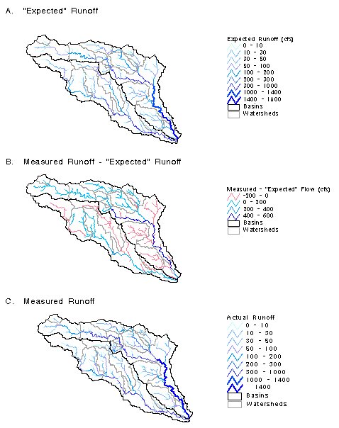 an expected runoff grid. For gaged watersheds, the difference