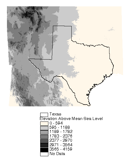 Before defining the drainage network using the eight direction pour point model, several processing steps were taken in order to create a "hydrologic" DEM from the raw DEM. First, the data from the two DEMs (Texas and Mexico) were merged into one grid. Next, the combined DEM was filled to remove pits. A pit is a cell or group of cells that is lower that all of its neighboring cells. Pits are removed so that there will be no discontinuities in the drainage network derived from the DEM; no internal drainage is allowed by this model. The DEM was also modified so that streams delineated from the DEM are consistent with digitized streams in EPA's River Reach File 1 (RF1). This process of DEM modification is referred to as "burning in the streams." The simplest stream burn-in procedure involves (1) creating a gridded representation of the digitized stream network (RF1) and identifying cells as being either stream cells or land surface cells, (2) raising the elevation of land surface cells relative to stream cells, and (3) deriving the drainage network based upon flow direction values defined by the burned DEM. Because many arcs in RF1 are not connected to the major river systems, burning in these arcs creates inland drainage basins or pits. Some of these disconnected arcs may represent real inland drainage basins or playas; however, information as to where inland drainage occurs was not readily available, so the DEM was filled a second time to eliminate pits created by the burning procedure. One drawback of the DEM analysis used here is that non-contributing drainage areas are considered as contributing to downstream runoff. This may cause the runoff per unit area estimates in some watersheds to be too low; however, the runoff total at watershed outlets is still consistent with measured flows. Figure 5.2 is a map showing the processed DEM and Figure 5.3 is a map showing RF1 streams.