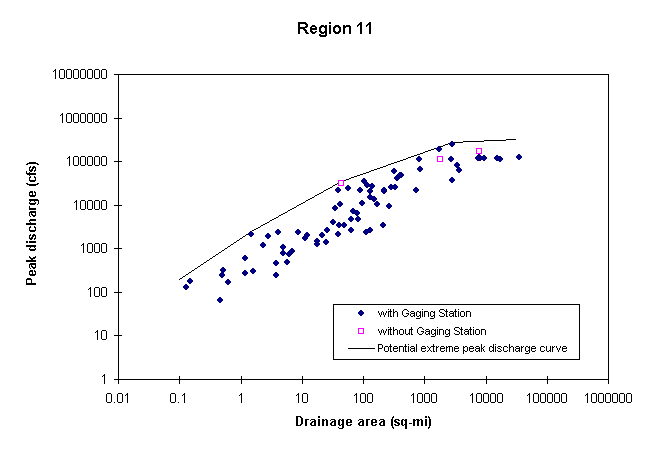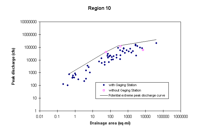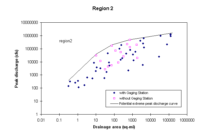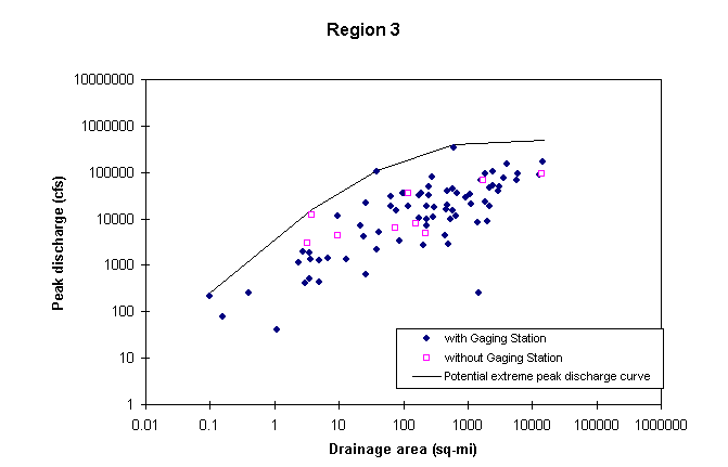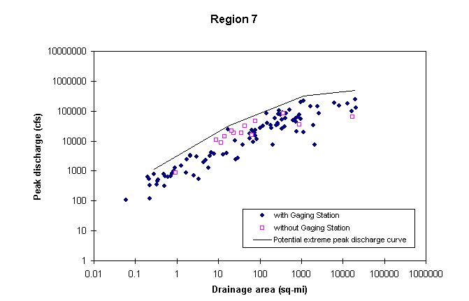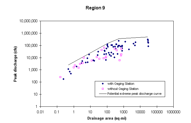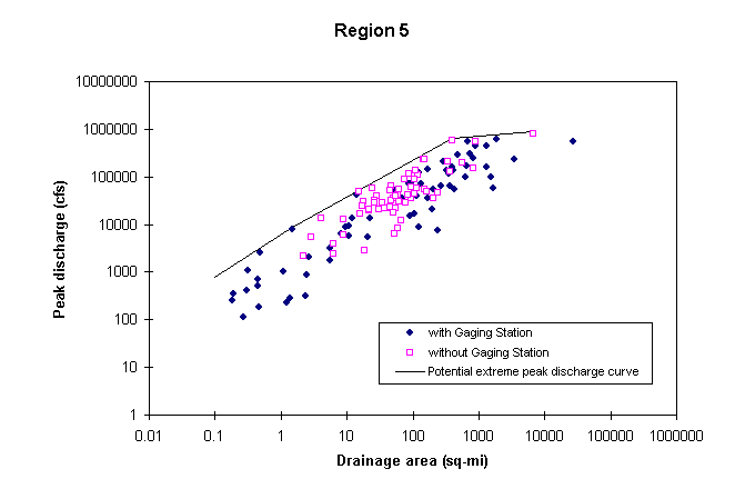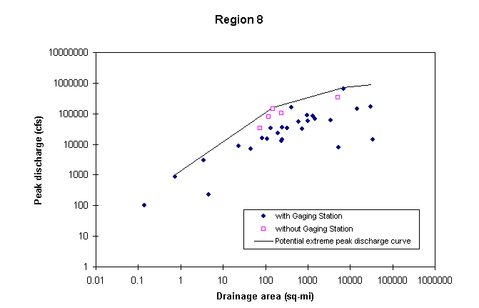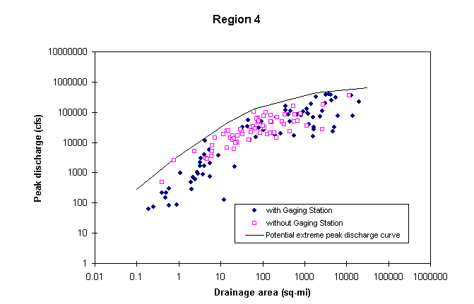 The methodology for estimating potential extreme peak discharges consists of plotting in a chart documented peak discharges vs. drainage area for all the stations of a hydrologic region, and drawing an envelope curve above all the observed values. Stations as far as 40 Km from the region border were also considered in the plot. In developing this curve, it was assumed that potential peak discharges are greater than the 100-year peak discharges, already available from other USGS studies. One envelope curve is to be developed for each hydrologic region and a set of mathematical equations is defined to describe this curve. These equations are available at Potential Extreme Peak Discharge Equations.