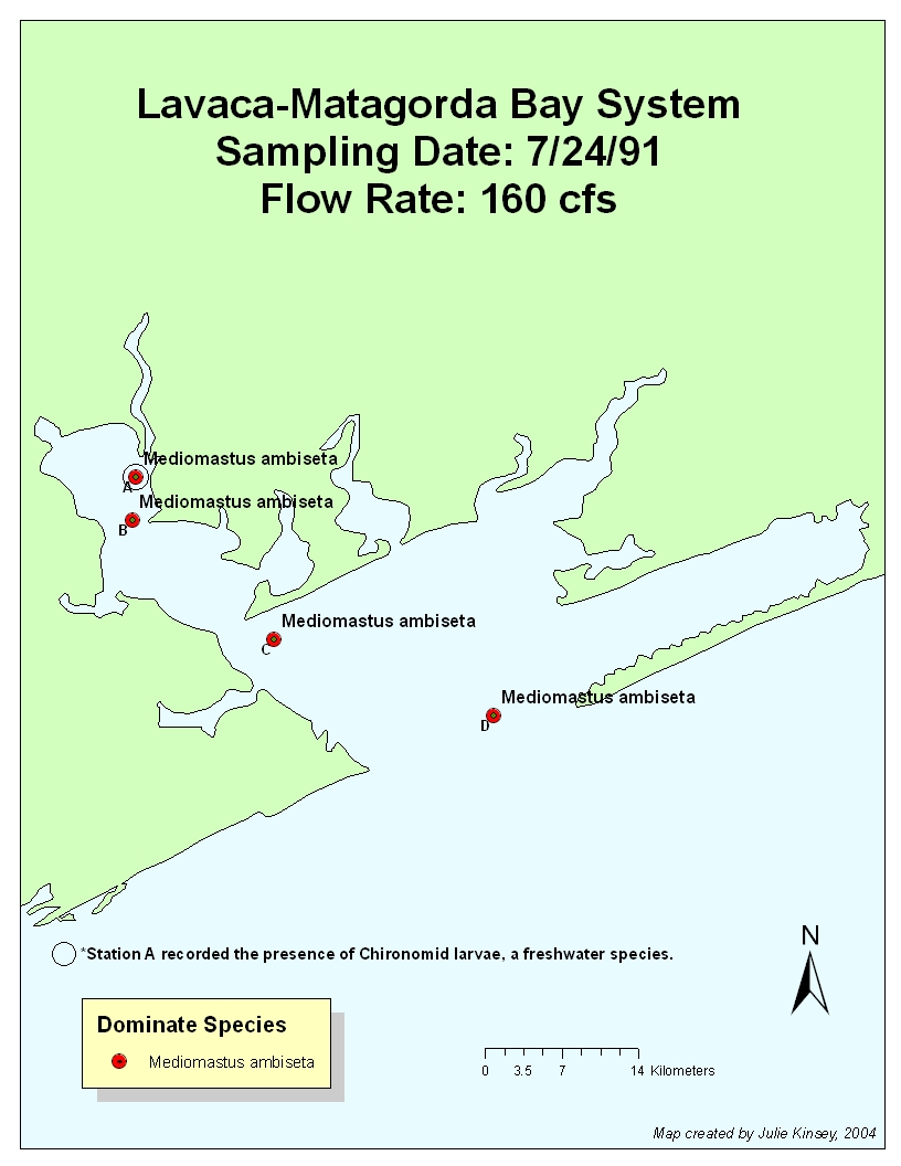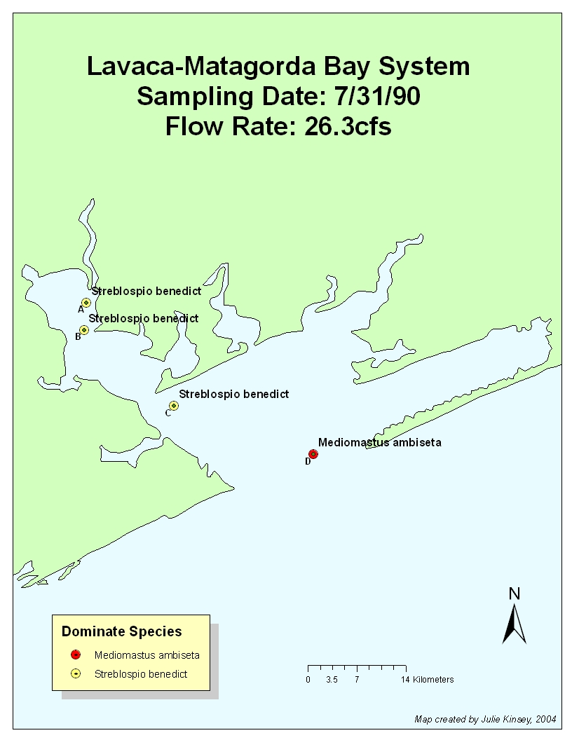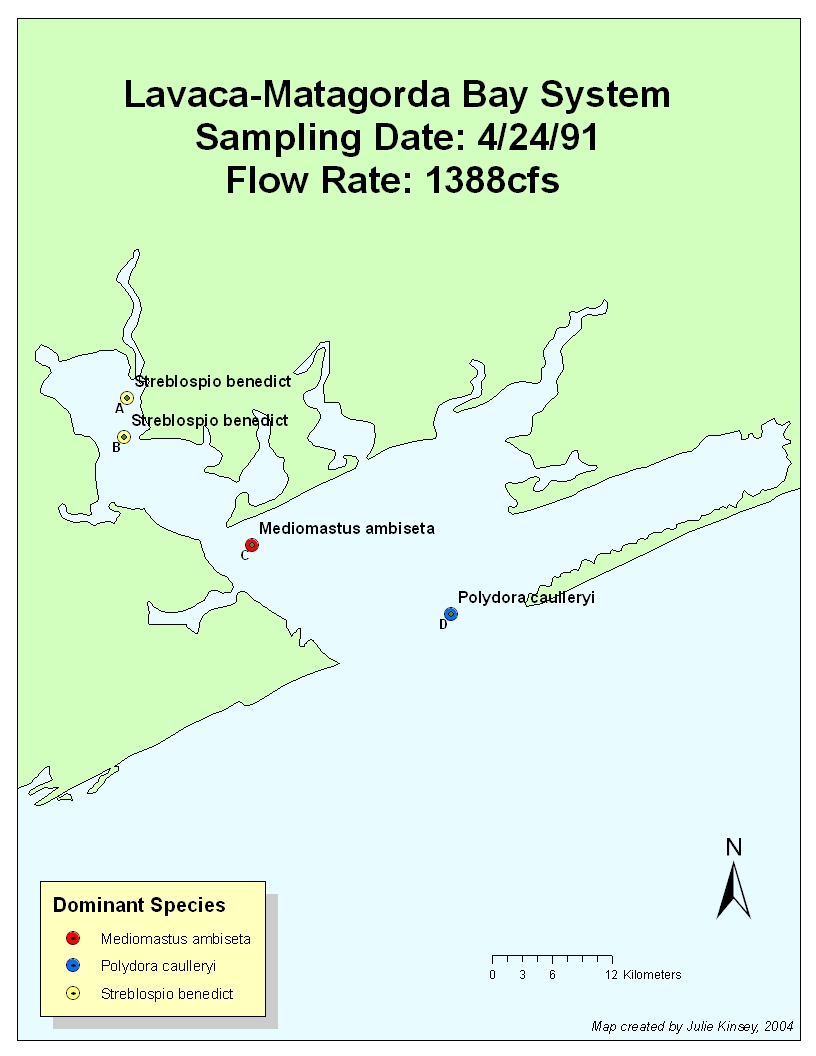 In the sites that I studied, two particular species generally dominated, Streblospio bendecti and Mediomastus ambiseta. The polychaete S. bendecti is a pioneering species that can respond quickly to disturbances in the environment. A suspension-feeder, it is generally found in the first 3 cm of the substrate. Mediomastus ambiseta, an equilibrium species, is a subsurface deposit-feeding polychaete that can be found in both the first 3 cm of the substrate, as well as below in the 3-10 cm range (Kalke and Montagna 1989, Martin 1994). Both species have wide tolerance ranges for changes in salinity. When other species are strained or killed by hypersaline conditions, both can survive and dominate. They can also dominate at higher inflows, as well. Streblospio benedicti can proliferate rapidly after significant disturbances, while M. ambiseta is most often able dominate after conditions stabilize.