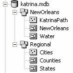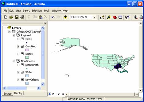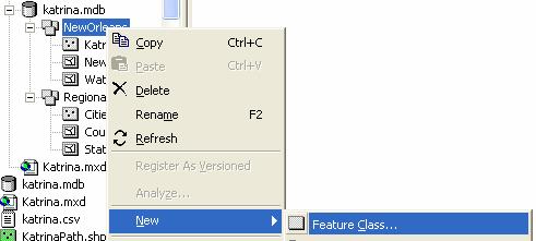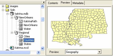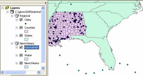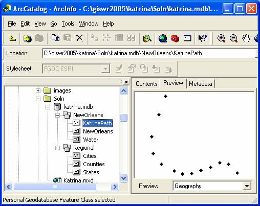 To complete this exercise, you'll need to run ArcGIS 9.1.   A geodatabase, katrina.mdb, with the GIS data has been prepared.  It can obtained from http://www.ce.utexas.edu/prof/maidment/giswr2005/ex1/katrina.mdb This geodatabase contains two feature datasets, NewOrleans, with data describing the hurricane’s path and the city and water features around New Orleans, and Regional, which contains background data – states of the United States and cities and counties in Louisiana, Mississippi and Alabama.