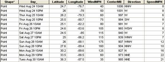 Data were extracted from these reports each 12 hours at 10AM and 10PM (Central Daylight Time) and compiled as a table, where Latitude and Longitude are the location of the eye of the hurricane in decimal degrees, WindMPH is the maximum speed of the hurricane winds in miles per hour, CenterMB is the air pressure in the eye of the hurricane in mb, Direction and SpeedMPH are the direction and speed of movement of the hurricane eye.   The latitude and longitude data were used to create a point feature class of the locations in the path of the hurricane in a manner that you will learn in Exercise 2 in this class.