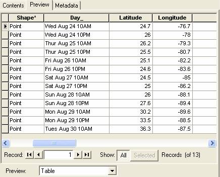 Switch the Preview option at the bottom of the map display to Table and view the tabular records for the hurricane path: