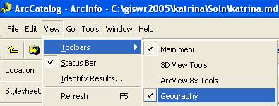Reset the Preview to Geography and pull down the Geography Toolbar from above the map display  .  If you can’t see this toolbar in your ArcCatalog view, use View/Toolbars/Geography and click on the toolbar name to make it appear.