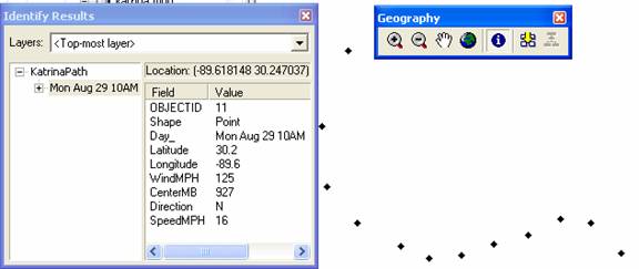 Select the Inquiry tool,   and click on the points on the hurricane path.  You can see the attributes of each point feature: