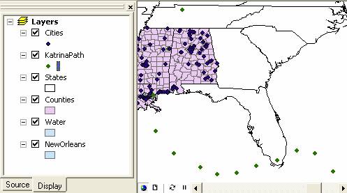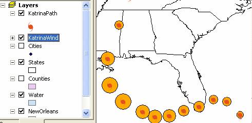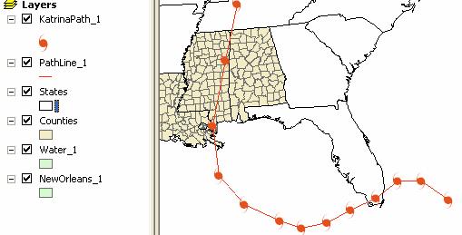 Note that although there are two entries in the table of contents, KatrinaPath and KatrinaWind, both of these refer to the same data within the geodatabase.  They are only different in their display properties within ArcMap.