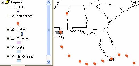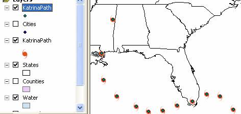 We know that the hurricane winds changed in strength with time and it would be useful to symbolize this in our map.   Click on the Add Data button  again and add the KatrinaPath theme to the map a second time by navigating to its location within the NewOrleans feature dataset, and selecting it.  You’ll see its dots overlie our hurricane symbols.
