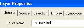Right click on the new KatrinaPath theme name and select , and the resulting Layer Properties dialog box, rename the Layer Name to KatrinaWind.  Hit Apply and then Ok, and you’ll see that the theme name is now KatrinaWind in the map Table of Contents.