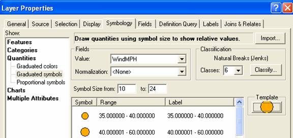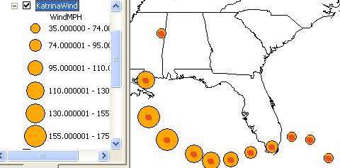 Right click again on the KatrinaWind theme name, select Properties as before, but now select the Symbology dialog box.  In the Show window, select Quantities/Graduated Symbols; in the Fields, Select WindMPH as the Value to be symbolized; in the Classification area, select 6 classes rather than the default 5.  Click on the Template for the marker and select a nice color like orange, and set the range of the symbol size from 10 to 24.
