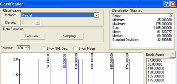 Right click again on the KatrinaWind theme name, select Properties as before, and select the Symbology dialog box.  Now click on the  box and in the Classification dialog, select the Manual method, and type in the Break Values 74, 95, 110, 130, 155, 175.  You’ll see the blue lines classifying the data shift to the required positions.   If you encounter an error here that says that the Graphics Engine could not be accessed and you have no option to choose manual, just use the automated limits to the wind velocity ranges that are set by the default display method, and continue on with the exercise.   Please note that you encountered an error in your solution.