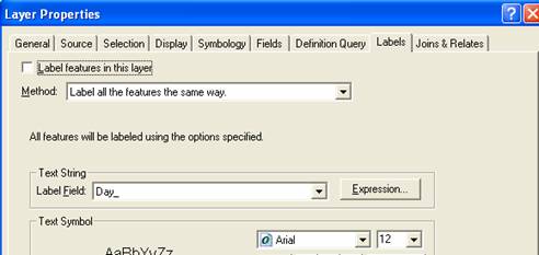We are starting to get something interesting looking now, but lets add the dimension of time to our map.  One of the attributes of the KatrinaPath theme is the data and time of the location point, in the Day_ attribute.   We will use this attribute to Label the path points.   Lets first make the labels into 12 point size.   Right click on KatrinaPath, choose Properties again but now Labels.   Choose Day_ for the Label Field and 12 for Text Symbol size.