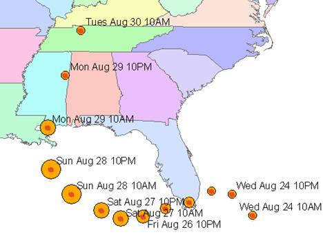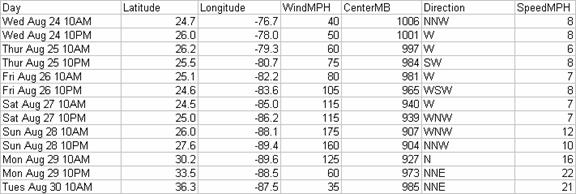 To be turned in:  How many points are there on the hurricane Katrina path?   What is the time interval between them?   What is the total time duration of the hurricane path depicted?   If a hurricane is defined as a storm having maximum wind speed of at least 75mph, for how long was Katrina a hurricane (as distinct from a tropical storm of lesser severity)?