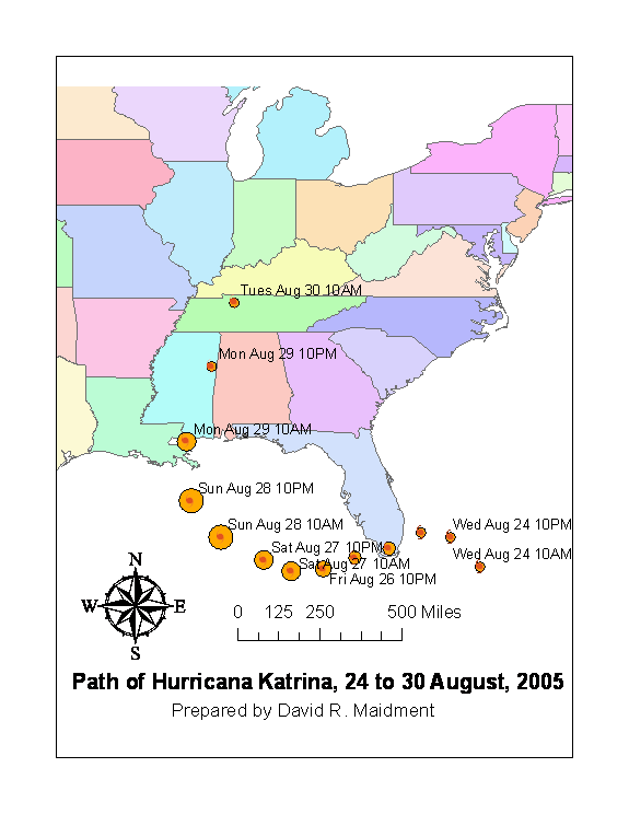 1.      Produced a regional map to show the path of Hurricane Katrina and the variation of the hurricane’s intensity along that path;