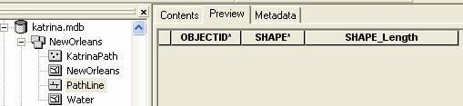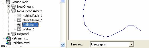 Navigate to the Katrina.mdb geodatabase and click to open it and its two feature datasets, as shown below.   In the Preview window, select the Preview tab at the top and KatrinaPath as the feature class, to create the display shown below: