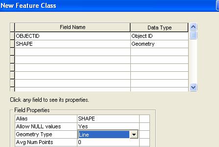 In the first screen, give the feature class the name PathLine, in the second screen accept the default configuration, in the final screen (and this is the tricky part), click on Geometry under DataType, and then in the window below, select Geometry Type as Line rather than the default Polygon type.  Click on Finish.  If you Preview your geodatabase with the Table option shown, you’ll see that for PathLine you have a table with some default fields available but no records in the table because you don’t have any lines yet.