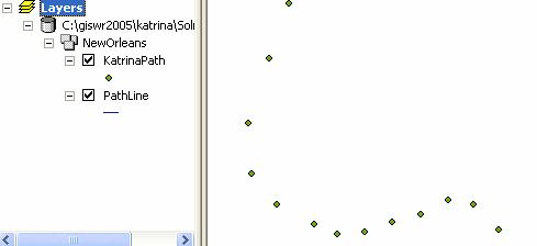 Now lets go back to ArcMap.  Close ArcCatalog.   Open a new blank ArcMap session, not your old Katrina.mxd because that has all your cartography set up in it and we want a clean slate for preparing new data.   Add the KatrinaPath points as a theme.  Add PathLine as another theme.   It seems best to do this sequentially rather than simultaneously or the points don’t display on the map view.  Use File/Save As to save your new map document as PathLine.mxd.