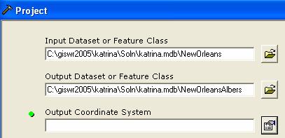 We are going to project all of the feature classes in the NewOrleans feature dataset to a new feature dataset called NewOrleansAlbers.    In the Project tool window, enter these dataset names in the first two windows, as shown.
