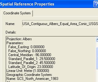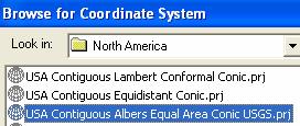 Select coordinate systems for North America and within those choices, select USA Contiguous Albers Equal Area Conic USGS.prj  This is a standard USGS map projection for continental scale maps of the USA, whose projection parameters are shown below.   You’ll learn more about how to interpret these parameters in a forthcoming class lecture.