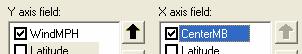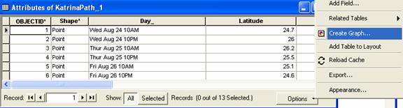 Open the Attributes of KatrinaPath_1 and click on Options and select Create Graph.  You’ll see a graph wizard appear.   In the first screen choose the Scatterplot , in the second screen choose WindMPH as the Y axis field and CenterMB as the X axis field