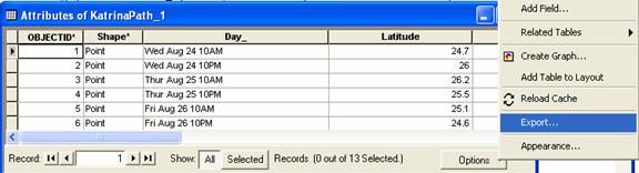 Ok, time for Plan B, lets go to our old friend Excel!  From the Attributes of KatrinaPath_1, choose Options/Export