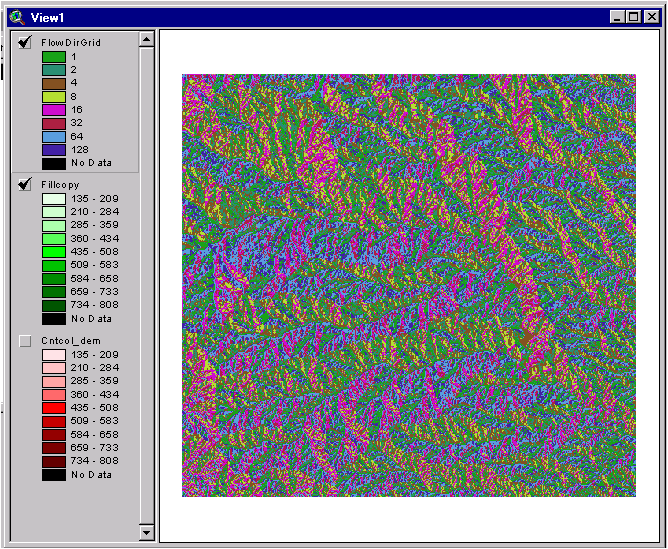 D. Compute the Flow Direction Grid With the DEM filled, the flow direction and flow accumulation calculations may be performed. Simply choose Hydro/Flow Direction, enter the name of your filled DEM (colfil) for the Input Theme 1, choose a name for Output Theme 1, (e.g. colfdr for Colorado Flow Direction) and select OK. After a minute or so, a flow direction grid will appear. Here is what it looks like: