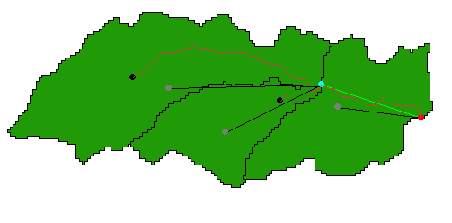 In sum, each black dot represents the most-upstream point of each defined stream. In addition, the blue dots are the outlet points from each sub-watershed. Green lines indicate a flow channel (i.e. the HEC-HMS will need to route water through these sections), while the red dot is the sink of the system. Not bad, eh??