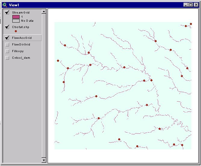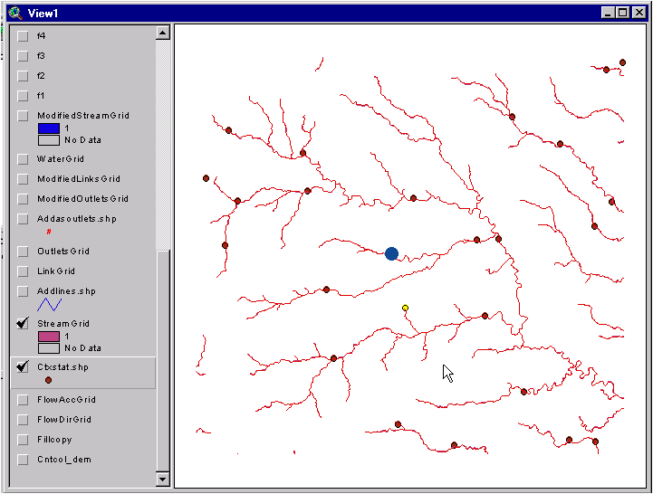 Note that I have hidden the legends for most of the themes so that it is easier to see which themes comprise the view. If you are interested, you may add/remove theme legends using Theme/Hide-Show Legend. It appears that a 1000-cell threshold for this system is adequate since just about all of the points fall closely to a stream. For your curiosity, you may want to zoom into some locations to see how close the points actually are.
